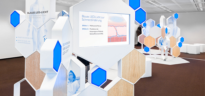 Zur Einführung eines innovativen Produktes aus dem Bereich Medizintechnik wurde eine bundesweite Roadshow inszeniert. Der Gast bewegt sich durch eine Symbiose aus Mediaparkour und Lounge. Vier Informationsmodule informiert den Gast über das Produkt, seine Wirkweise und Handhabung. Der Raum zwischen den Modulen ist mit bequemen Loungemöbeln ausgestattet und lädt zum Verweilen bei entspannten Gesprächen ein.