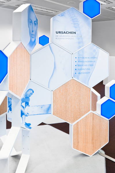 Die hexagonale Struktur auf der Oberfläche des Produktes bildet die Grundlage für die Formsprache des Designs. Sowohl Aufbau und Konstruktion der Informationsmodule als auch die Positionierung der einzelnen Elemente orientiert sich an dieser Struktur. Durch die Modularität des Konzeptes lässt sich das Interior den jeweiligen räumlichen Gegebenheiten anpassen. Als Materialien wurden Pulver beschichtete Stahlrahmen, gekalktes Eichenfurnier und hinterleuchtetes, blaues Acryglas verwendet.